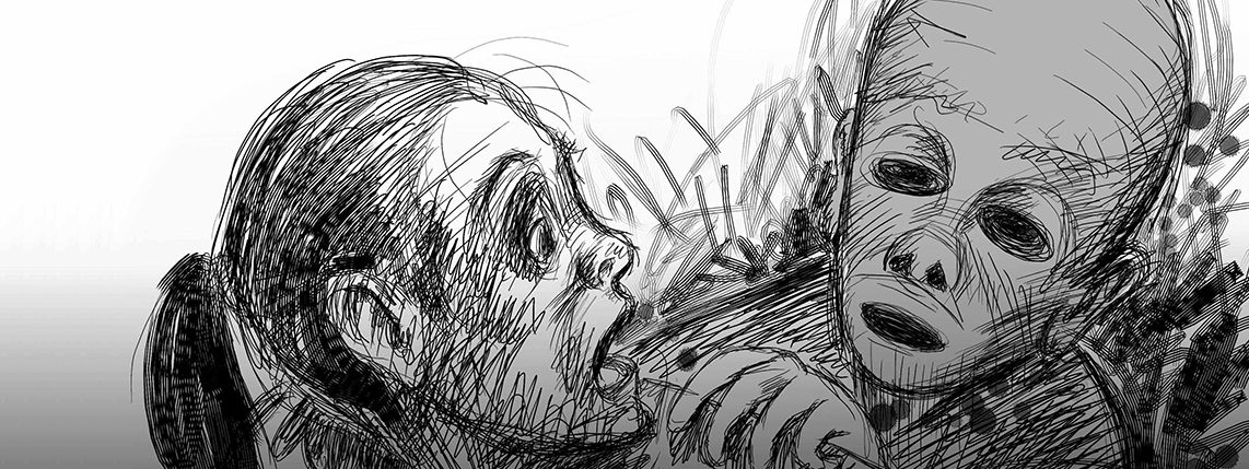 A man is carrying a child on his back. There is, however, something sinister about the boy that makes the man eager to get rid of him. The man determines to abandon the child in a forest. Despite appearing to guess his intention, the boy leads the man across the paddies to the foot of a large cedar at the edge of the wood. It is revealed that the boy is none other than the spirit of a blind monk, whom the man had murdered in that very place many years before.